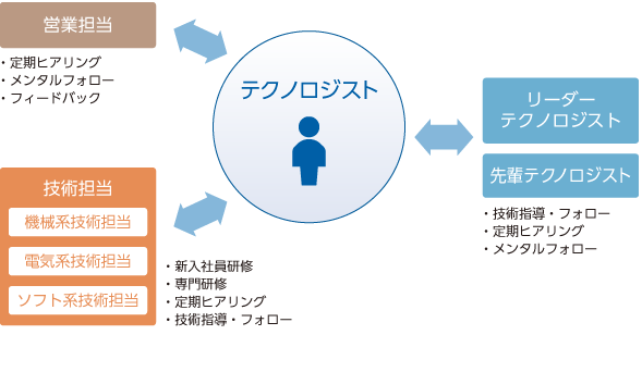 テクノロジストには、必ず担当する営業がおり、定期ヒアリングとフォローを実施します。また、技術分野ごとに専任の担当者を配置し、専門研修の実施、技術フォローを行っています。