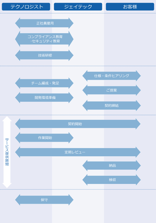 プロジェクトの円滑な進行を目的として、お客様からのご評価をテクノロジストに、テクノロジストとの面談内容やそれに対する当社の対応をお客様にお伝えすることで、常にお客様・ジェイテック・テクノロジストの3者が情報を共有している状態を作り上げます。