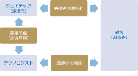 ジェイテックでは「技術職知財リース事業」を行なうにあたり、お客様のご要望に応じて、派遣契約または請負契約・業務委託契約によるサービスをご提供しています。